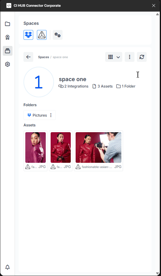 The Spaces feature allows users to create personalized workspaces that collect and organize assets and folders from different connected DAM systems. This offers a flexible, centralized way to manage assets across multiple integrations.