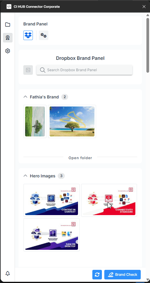 The Brand Panel is the centerpiece of the CI HUB Brand Connector experience, offering direct access to curated, pre-configured brand assets and templates.