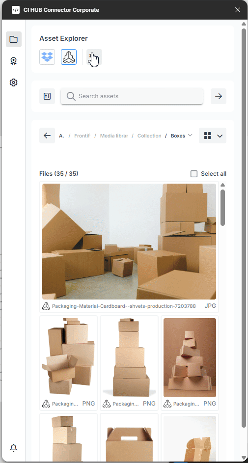 The Asset Explorer is the central hub where you manage, search, and preview assets from your connected integrations. It is designed for quick access and flexibility.