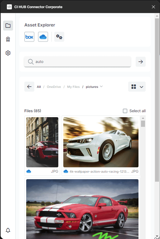 All active connections are listed below the search bar. Clicking one reveals its folders and assets. You can toggle between grid and list views and apply filters such as date or size to refine the display.
