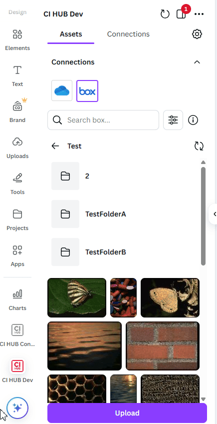 This feature enables users to upload files from their Canva designs or local system directly into their preferred DAM system, placing them in the currently opened folder. Users can upload multiple files simultaneously from both Canva and their file system.