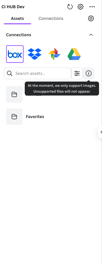 The CI HUB Connector filters out unsupported files, displaying only those compatible with Canva. An always-visible info tooltip informs users that unsupported formats are filtered out, providing clarity and helping make asset management faster and more intuitive.