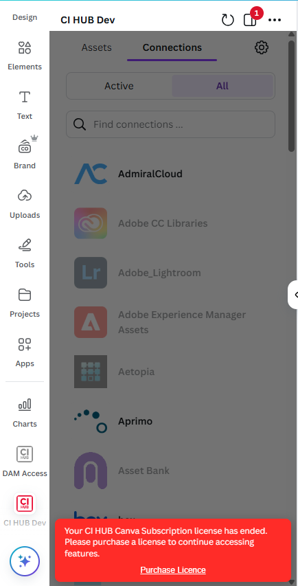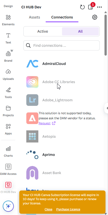 The CI HUB Connector for Canva provides users with easy access to all account and license information. Users can view their account details, as well as their current license type and expiration date.