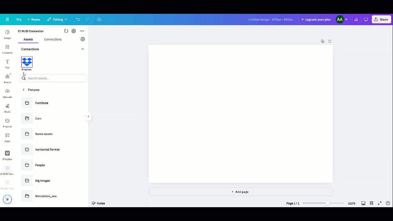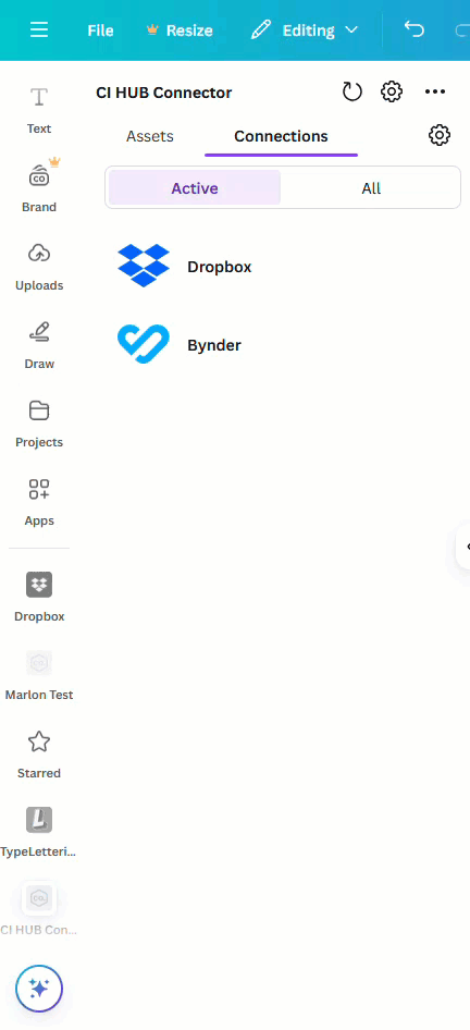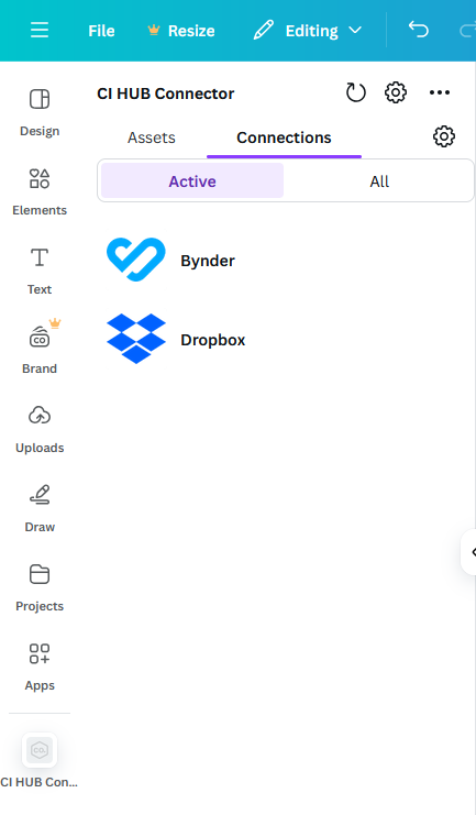 After successfully adding a new connection in Canva through the CI HUB Connector, you will find it listed in the "Active Connections" section. This section displays all your currently available connections, making it easy to manage and navigate between them.